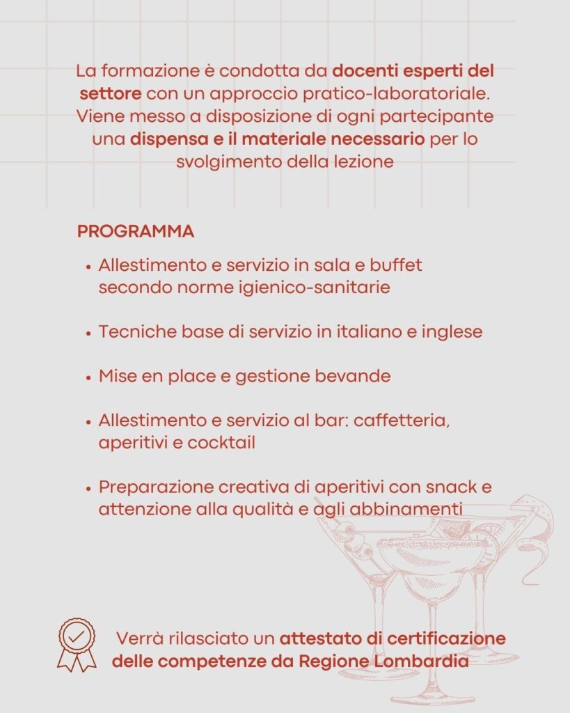 Al termine del percorso verrà rilasciato un attestato di certificazione delle competenze riconosciuto da Regione Lombardia, un valore aggiunto fondamentale per chi desidera inserirsi o crescere nel mondo del bar e dell’accoglienza.